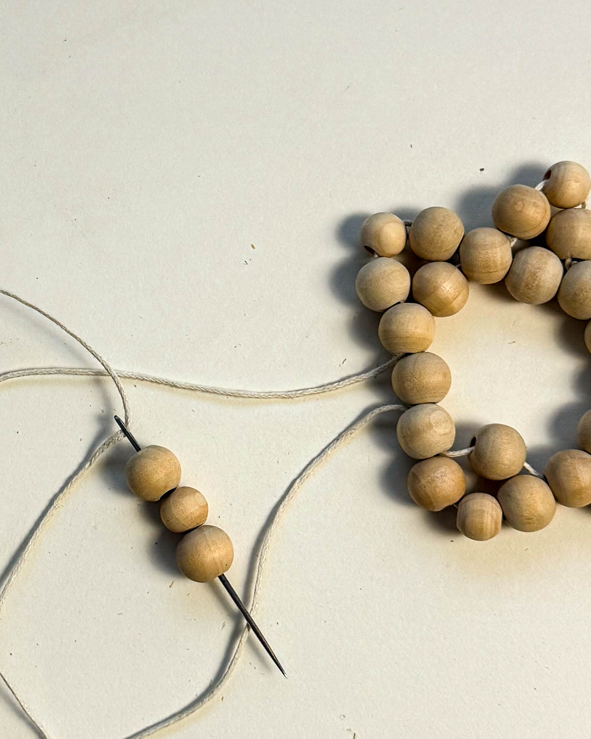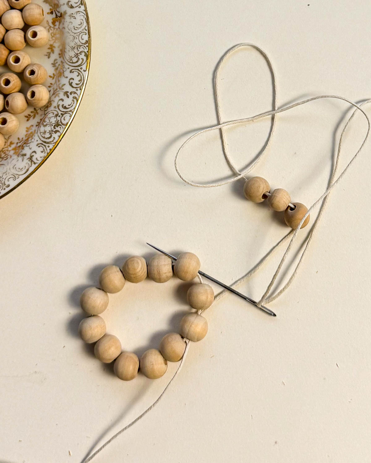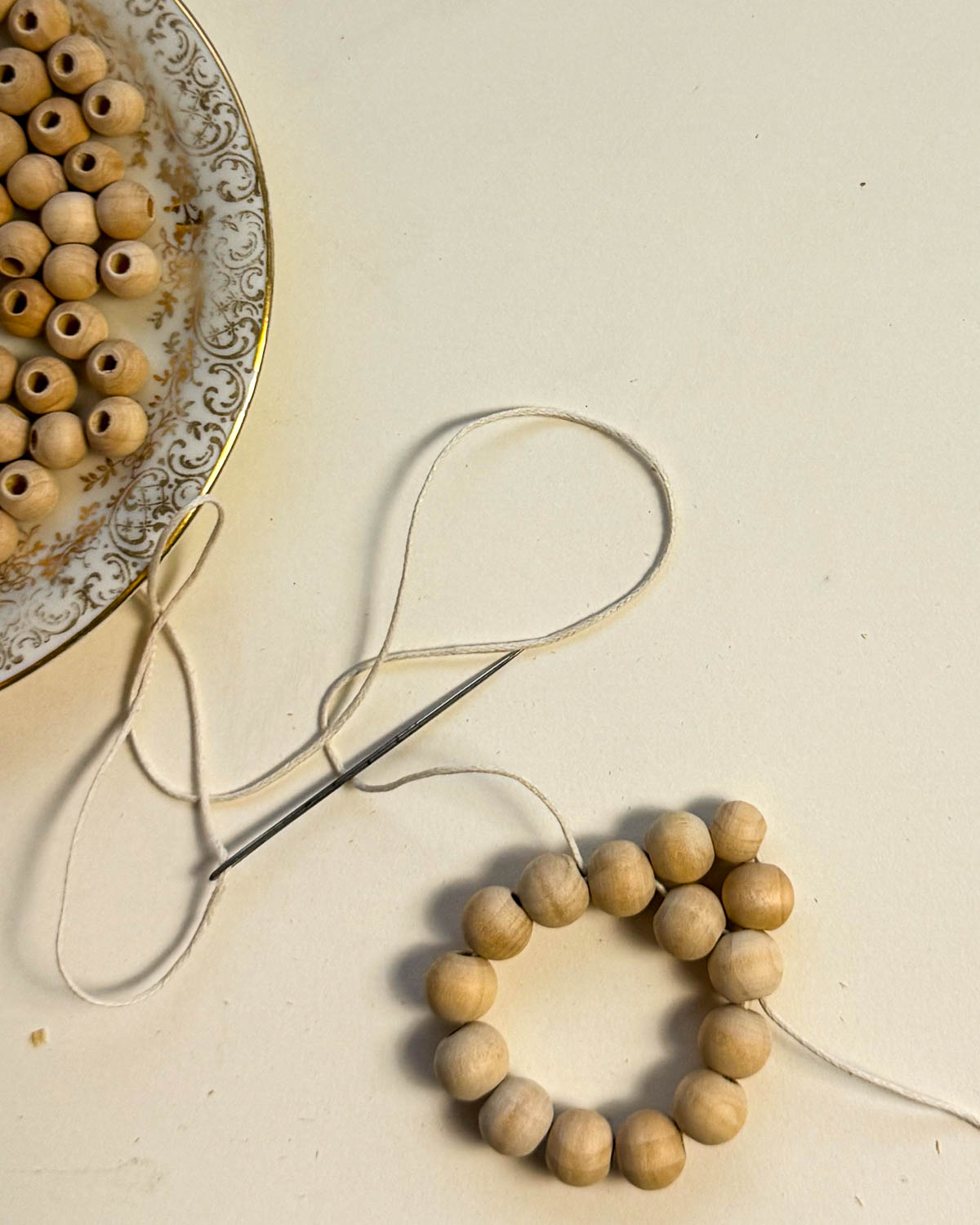 Ziehe die 12 Perlen vorsichtig zu einem Kreis zusammen. Fädle das Fadenende wieder durch die erste Perle und verknote die Enden fest, sodass ein stabiler Ring entsteht. Schneide das überstehende Fadenstück nicht ab – du brauchst es noch!
