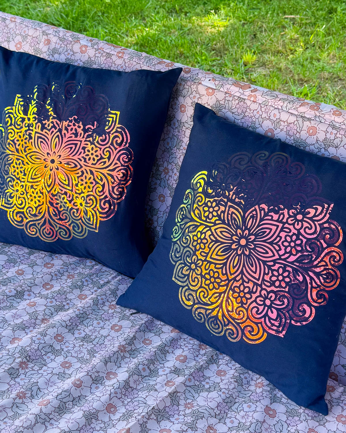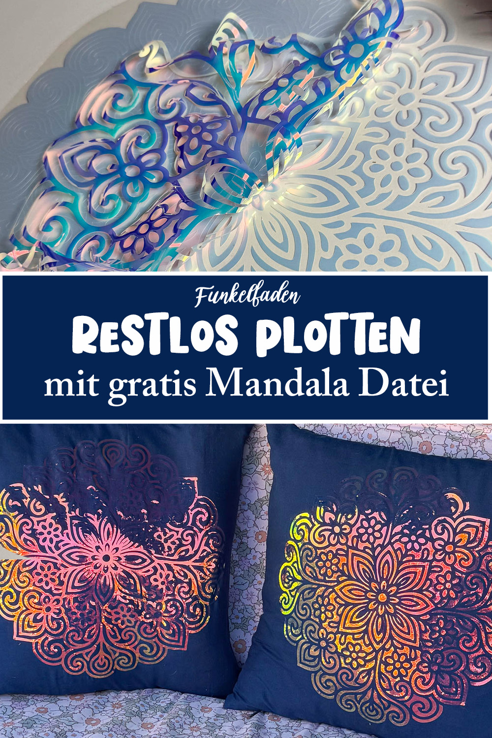 Was das Projekt besonders macht: Ich nutze nicht nur das geplottete Motiv – sondern auch das Negativ der Folie als zweites Bügelbild. So entstehen aus einer Mandala-Datei gleich zwei Kissenmotive, wir haben kaum Müll und sparen auch noch Folie.