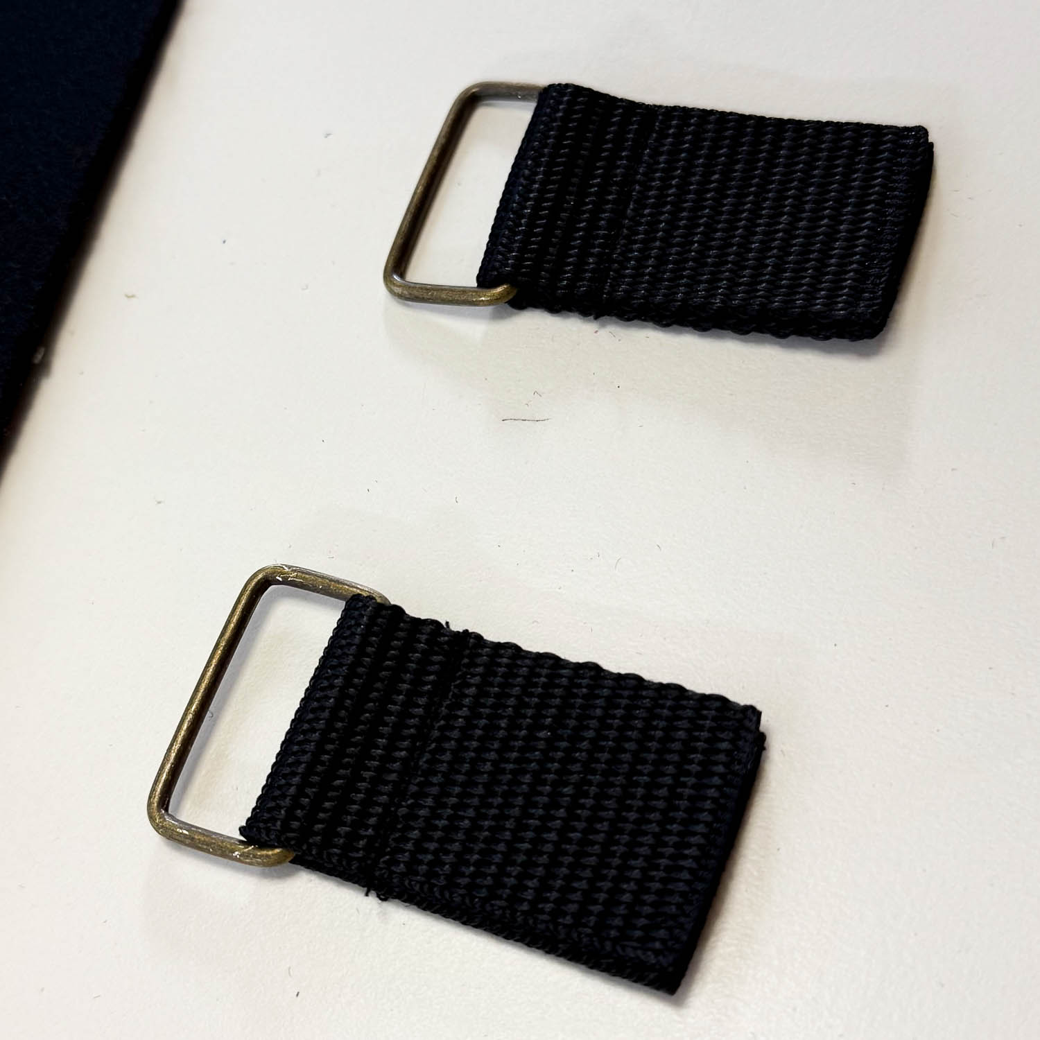 Wir schieben das Gurtband durch die Metallteile und schlagen es doppelt und stecken es fest. Unterhalb des Metallteils nähen wir knappkantig fest.