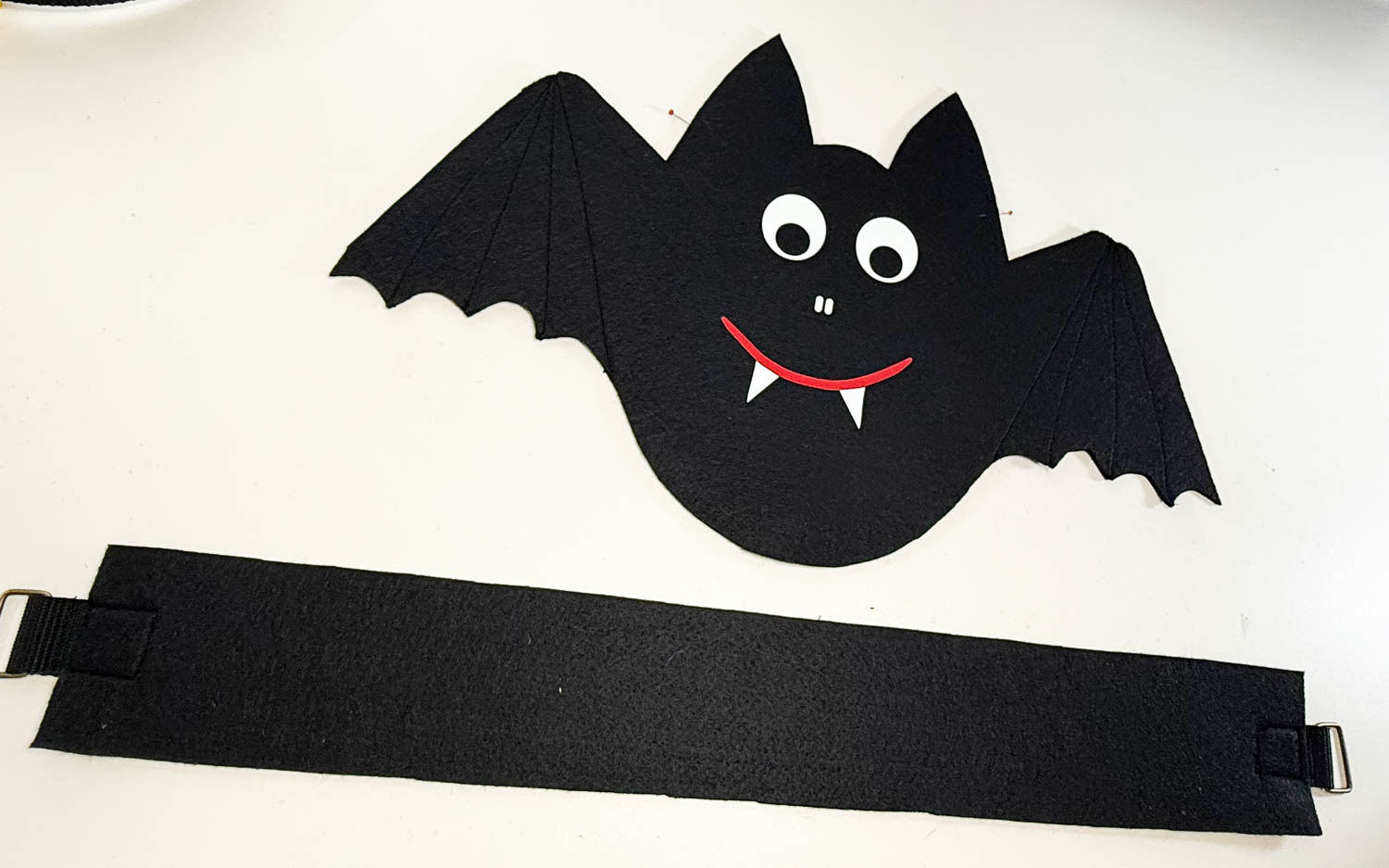 Schneide die Fledermaus aus dem Filz aus. Dabei schneidest du 1x die Fledermaus mit Flügeln und 1x die Fledermaus ohne Flügel zu sowie 1x den Streifen aus.