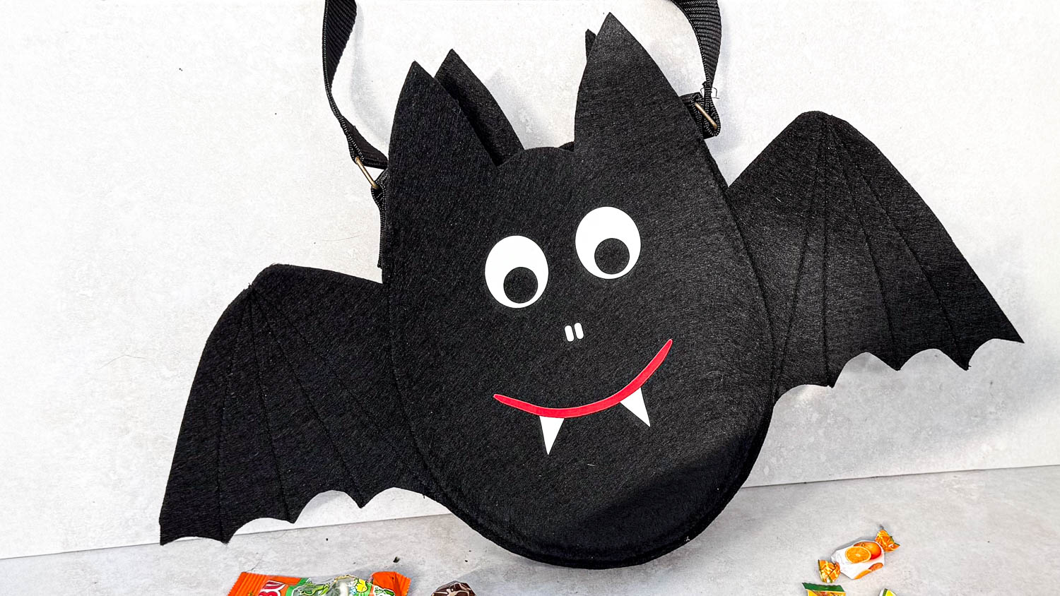 Fledermaus Fredi ist da! Eine niedliche Filz-Tasche mit Flügeln, perfekt zum Sammeln von Süßigkeiten – oder als kleiner Hingucker für die Halloween-Party.