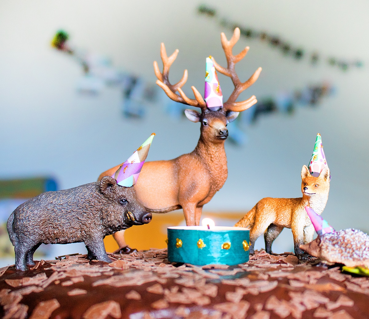 Auf dem Kuchen stehen diese Schleich Waldtiere (hier erhältlich) / Werbung , die meiner Meinung nach ziemlich hochpreisig sind, aber offenbar konkurrenzlos. Und sie sind ja auch wirklich hübsch anzusehen. Aus Papier haben die Tierchen noch kleine Partyhüte bekommen, dazu einfach ein Rechteck ausschneiden, mittig zusammendrehen und zusammenkleben. Dekoriert wird es mit Glitzerkleber und fertig sind die Waldbewohner für die Geburtstagsparty. Fehlt nur noch die Geburtstagskerze, schlicht improvisiert aus einem Teelicht mit Masking Tape und ein paar Glitzerpunkten. Manchmal muss es gar nicht so kompliziert sein.
