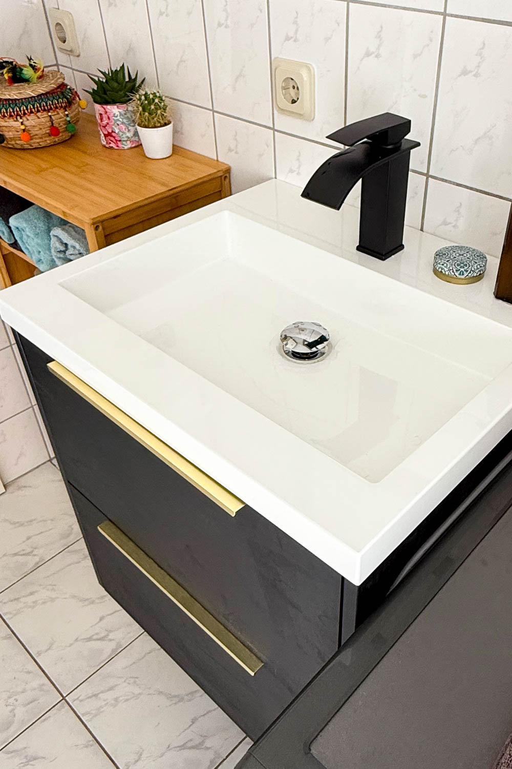 Besonders praktisch ist das mineralgegossene Waschbecken – es fühlt sich angenehm glatt an, ist pflegeleicht und die Form ist so clever gewählt, dass man richtig gut Platz zum Händewaschen hat, ohne dass Wasser ständig daneben tropft (wer kennt’s nicht? 😅).