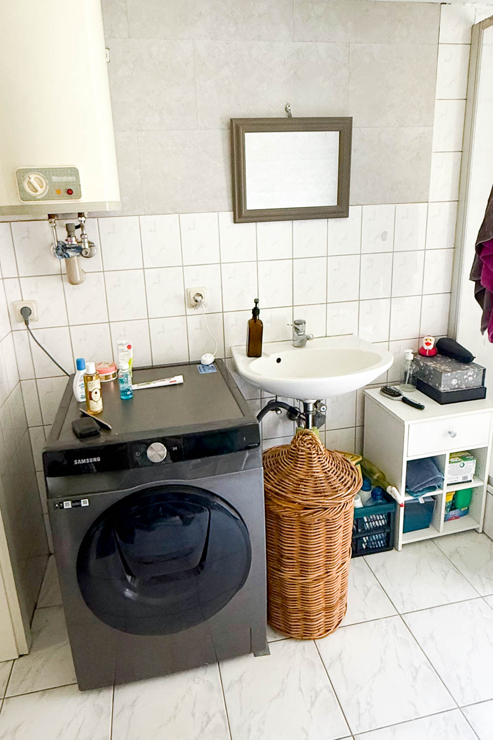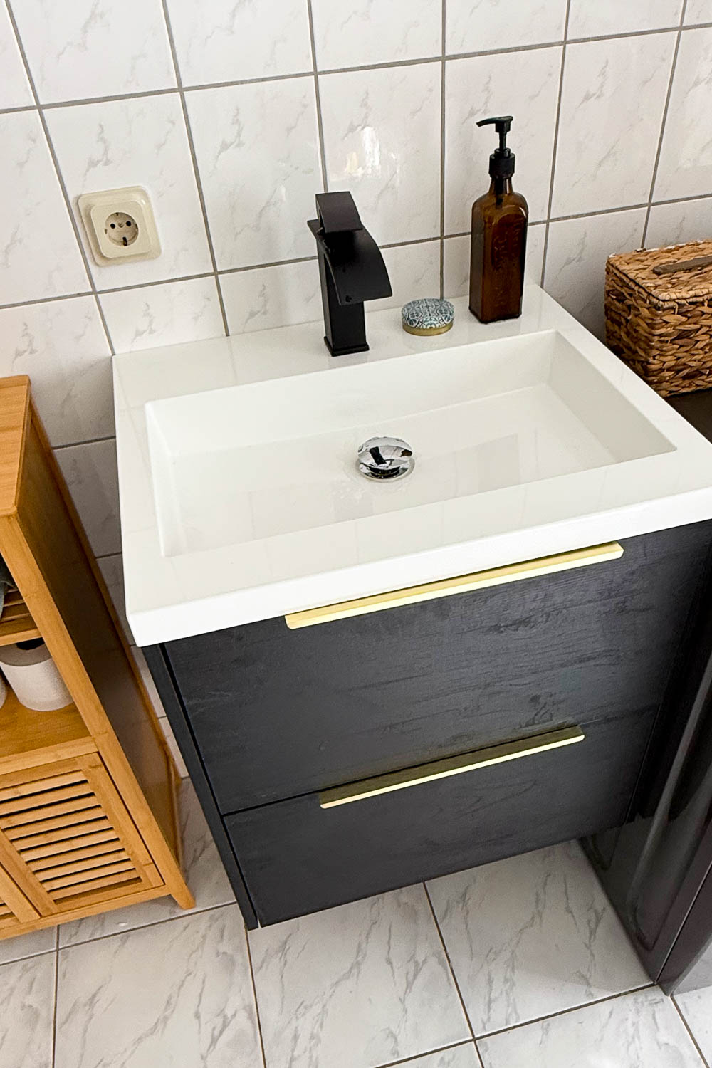 Jetzt war endlich das Waschbecken dran! Das alte Becken war nicht nur angeschlagen, sondern auch der Siphon war offen sichtbar und nicht gerade eine Zierde. Außerdem blockierte mein großer Waschtrockner den Durchgang in den Flur – leicht unpraktisch, aber es gibt keinen anderen Ort im Haus, der Anschlüsse und Platz für dieses Gerät bietet und ich hatte leider vergessen vor den Kauf auszumessen, ob er überhaupt ins Bad passt 😅